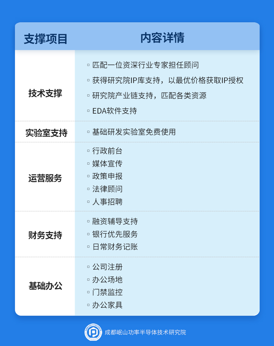 为更快聚合人才,更好地推动产业发展,成都岷山功率半导体技术研究院引进专家资源、聚力产业资源,高规格打造产业孵化平台,为敢想敢梦的追梦才子们打造一个专业级的创业平台,为初创企业提供资金、市场、管理、生产等服务,让技术人才更专心产业研发,让创业者更好发展公司。